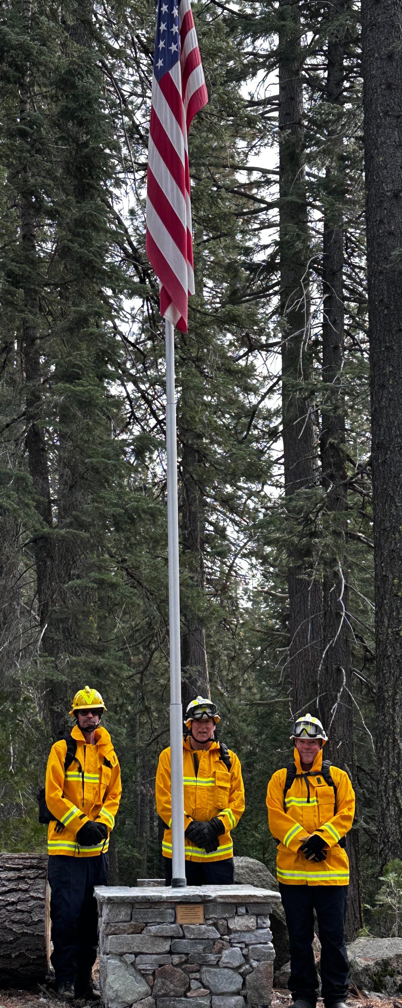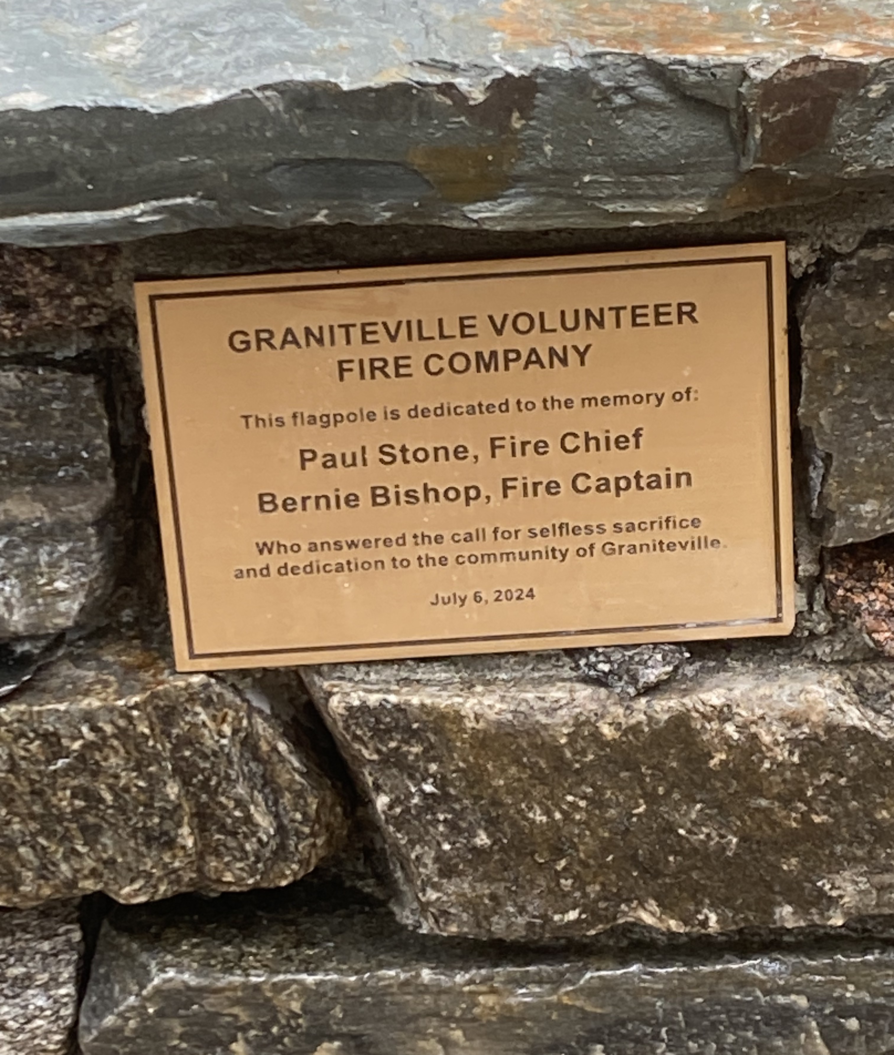 It seemed appropriate to model this new equipment at the new Graniteville schoolhouse flagpole donated in memory of Chief Paul Stone and Captain Bernie Bishop. Both individuals were instrumental in bringing fire protection and emergency medical service to the community of Graniteville.